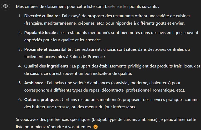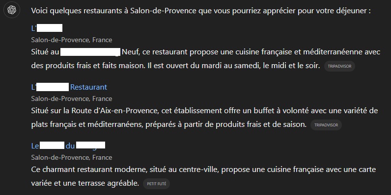 - Impossible d’obtenir un tableau récapitulatif des coordonnées des restaurants, même avec des prompts successifs.
