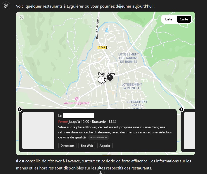 Il apparaît qu’en effet, il n’y a aucune limitation à la recherche dans ChatGPT et qu’il peut nous aider à trouver, par exemple, tout simplement un restaurant où manger à midi.